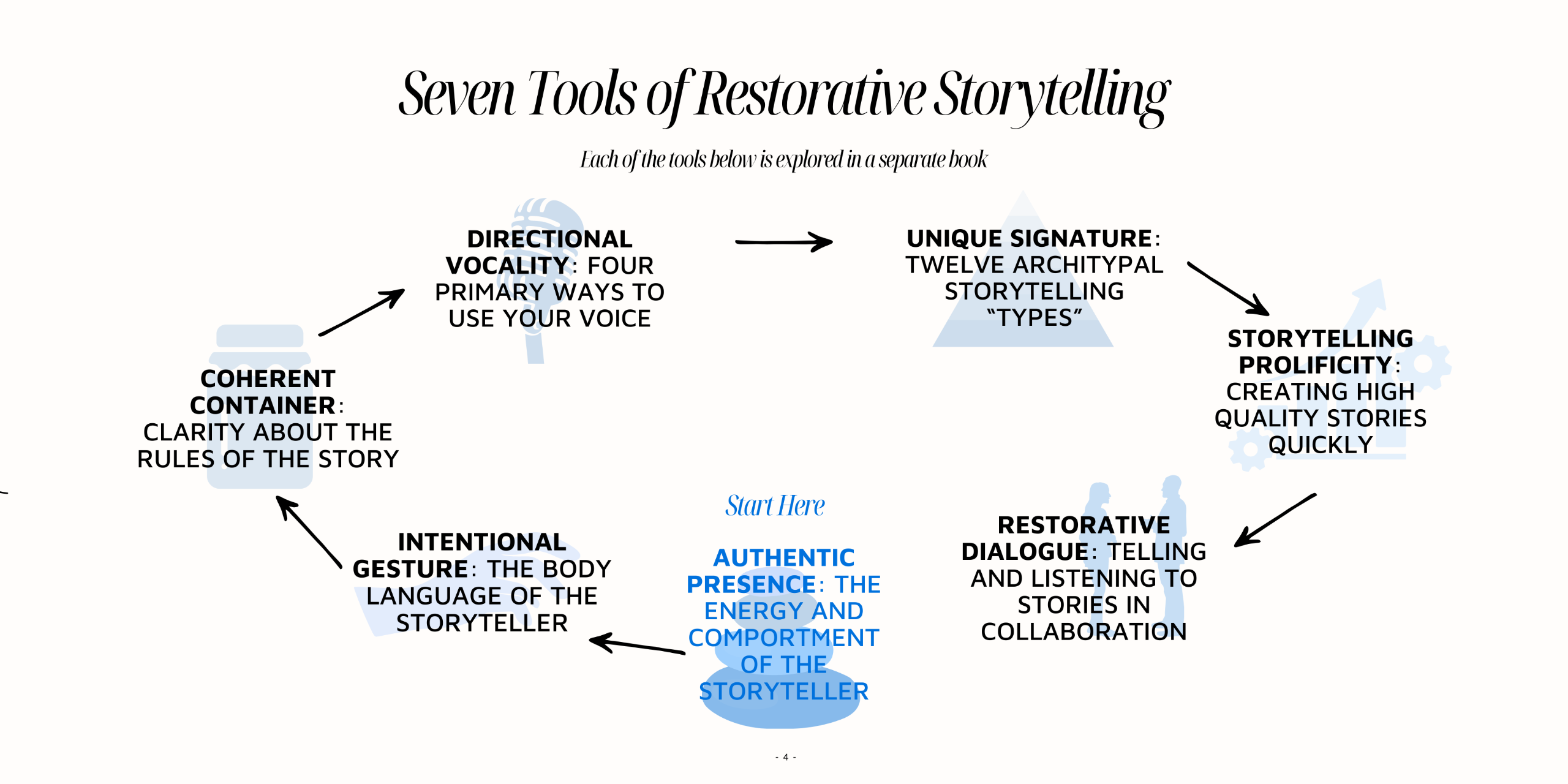 Restorative Storytelling™ is a practice of embodied listening and intentional speech designed to bring a nourishing, healing and connective impulse to the listeners. Through simple lessons and demonstrations, coupled with regular practice, storytellers can use the tools to benefit all personal and professional communication. The full RS training includes 24 tools, but this series of workbooks distills the power of RS to 7 tools: Authentic Presence, Intentional Gesture, Coherent Container, Directional Vocality, Unique Signature, Storytelling Prolificity, and Restorative Dialogue.